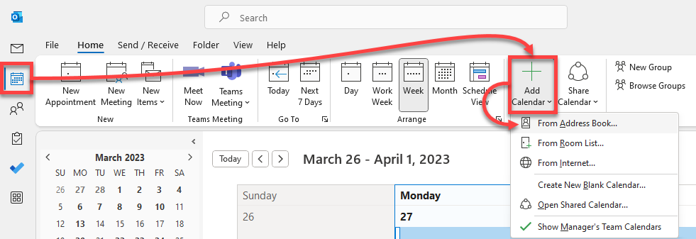 - Old Outlook Version: Go to the Outlook calendar, click on Add Calendar , from the Address Book, search for Minibus NEW, and open the shared calendar.