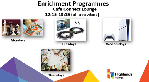 Further big news is that the play station is now in place, in a secure box in the lounge area outside the Student Life office. You may also have seen that the Scalextric track is now in place in the lounge and sessions take place with Mike on Tuesdays at 12.15- 1.15.