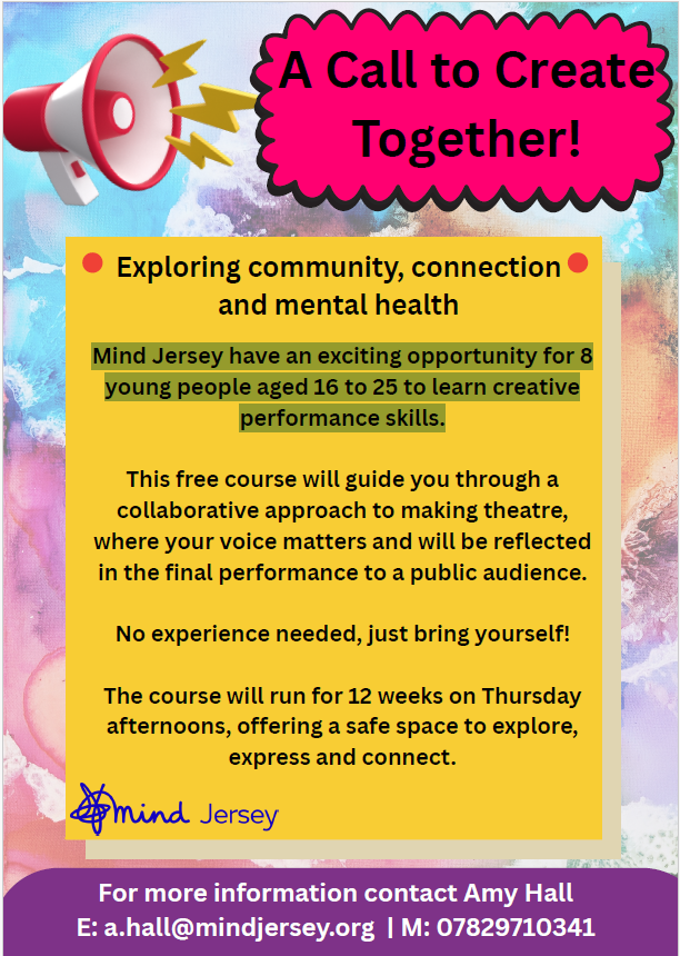 You will also hopefully have seen information sent out from Mind Jersey, who are offering an exciting opportunity for 8 young people aged 16 to 25 to learn creative performance skills with the aim of exploring community, connection and mental health. This is a free course that will guide young people through a collaborative approach to making theatre, where their voice matters and will be reflected in the final performance to a public audience. No experience is needed – see the poster for contact details and more information.
