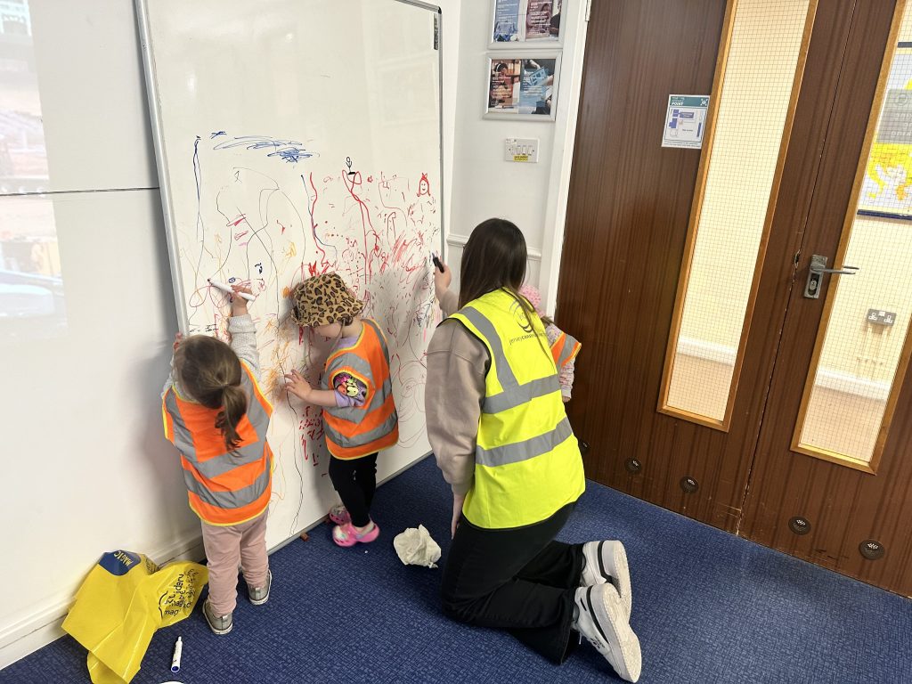 The children used architects drawing boards to do some colouring in, guided by their key workers and our BTEC/DEC! students and they had a go at building a train track, using building blocks and wearing construction P.P.E.