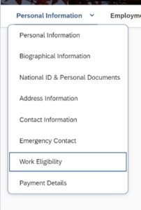 - Click on Personal Information, and select the drop down called ‘Work Eligibility’