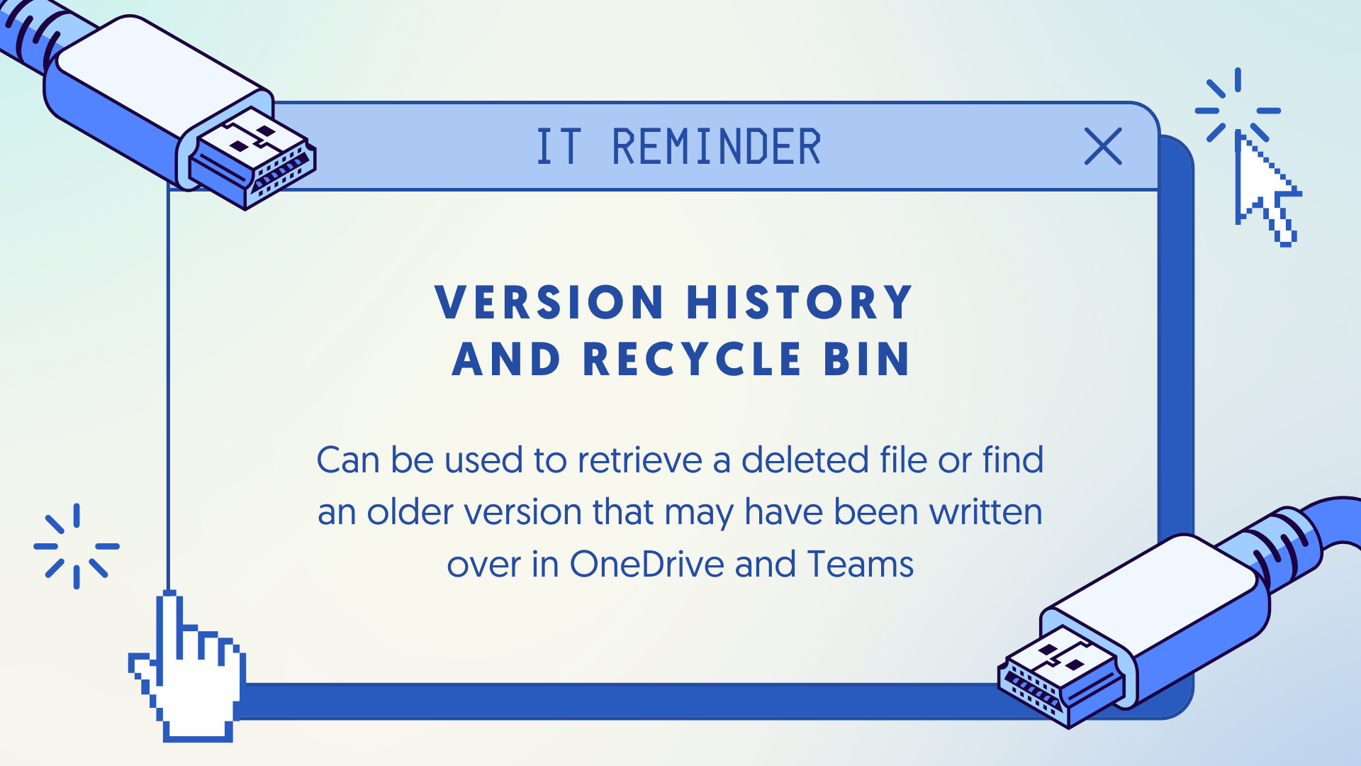 IT Top Tips! This week’s IT Top Tip is… . . . IT Reminder: Version History and Recycle Bin Can be used to retrieve a deleted file or find an older version that may have been written over in OneDrive and Teams. Step-By-Step Guide Vanessa Previous post Mental Health & Well-being Weekly 16 December 2024 Next post The Power of Dyslexic Thinking 16 December 2024