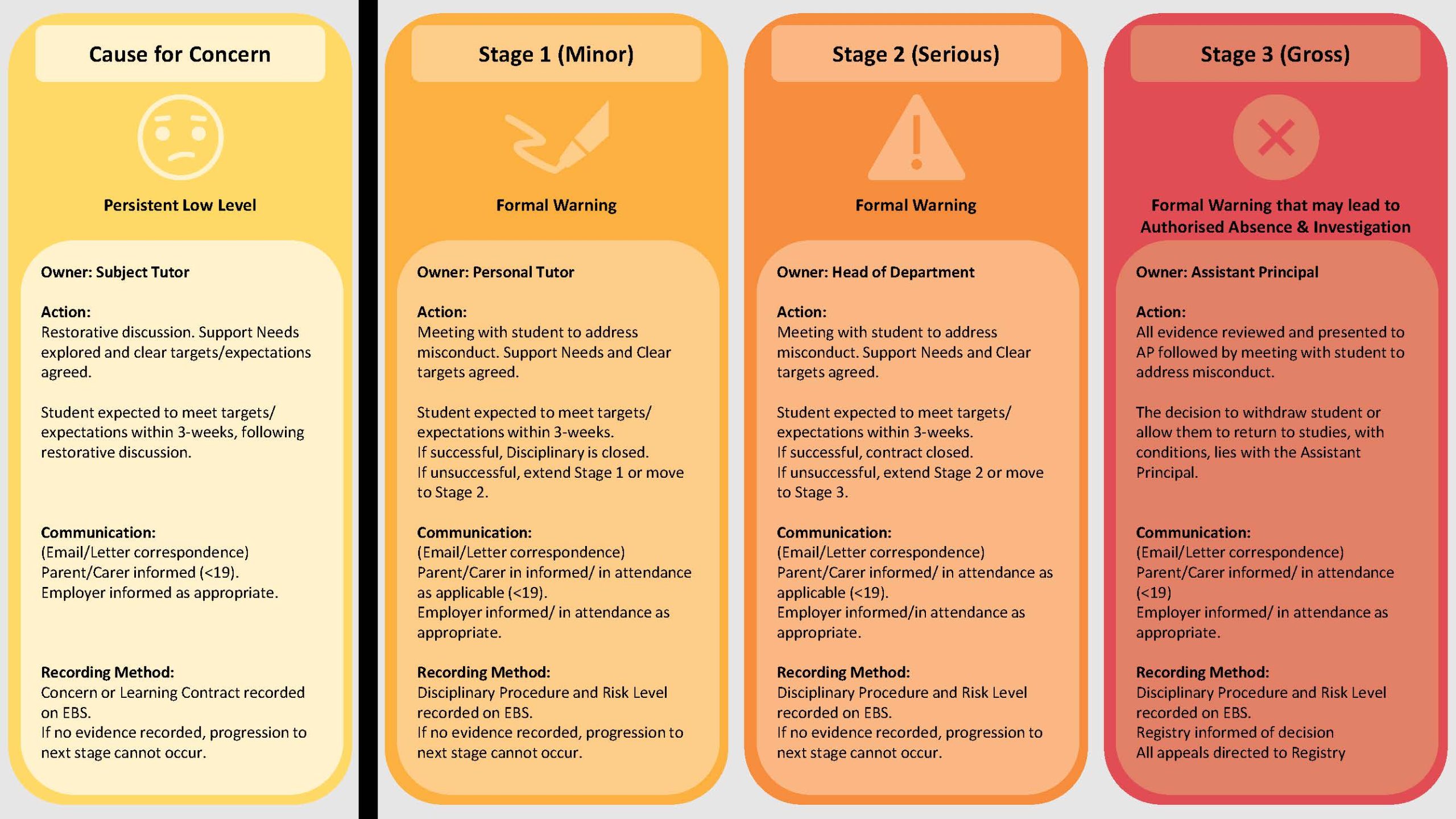 Nevertheless, there are times when it is necessary to address behaviours, attitudes or attendance that falls outside of the Student Agreement and is considered not to be to an acceptable standard or a matter of student misconduct. In those circumstances it is necessary to refer to the Student Code of Conduct and Disciplinary Policy.