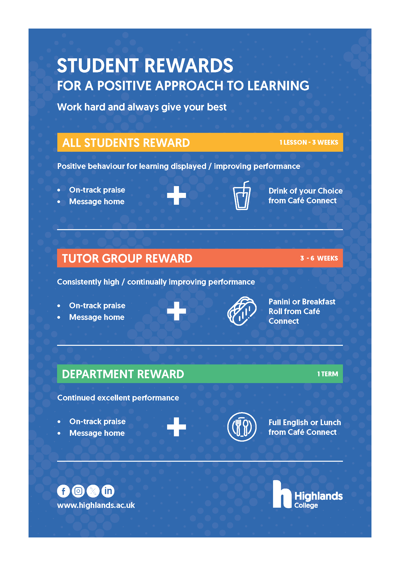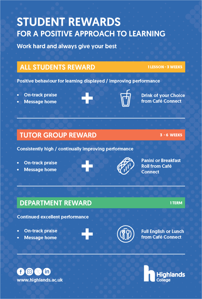 At Highlands College, we are proud to celebrate those students who consistently achieve and exceed expectations (considering starting points and student context). As we recognise the importance of praising and celebrating students, we must also ensure this is done consistently to best support student progress and progression.