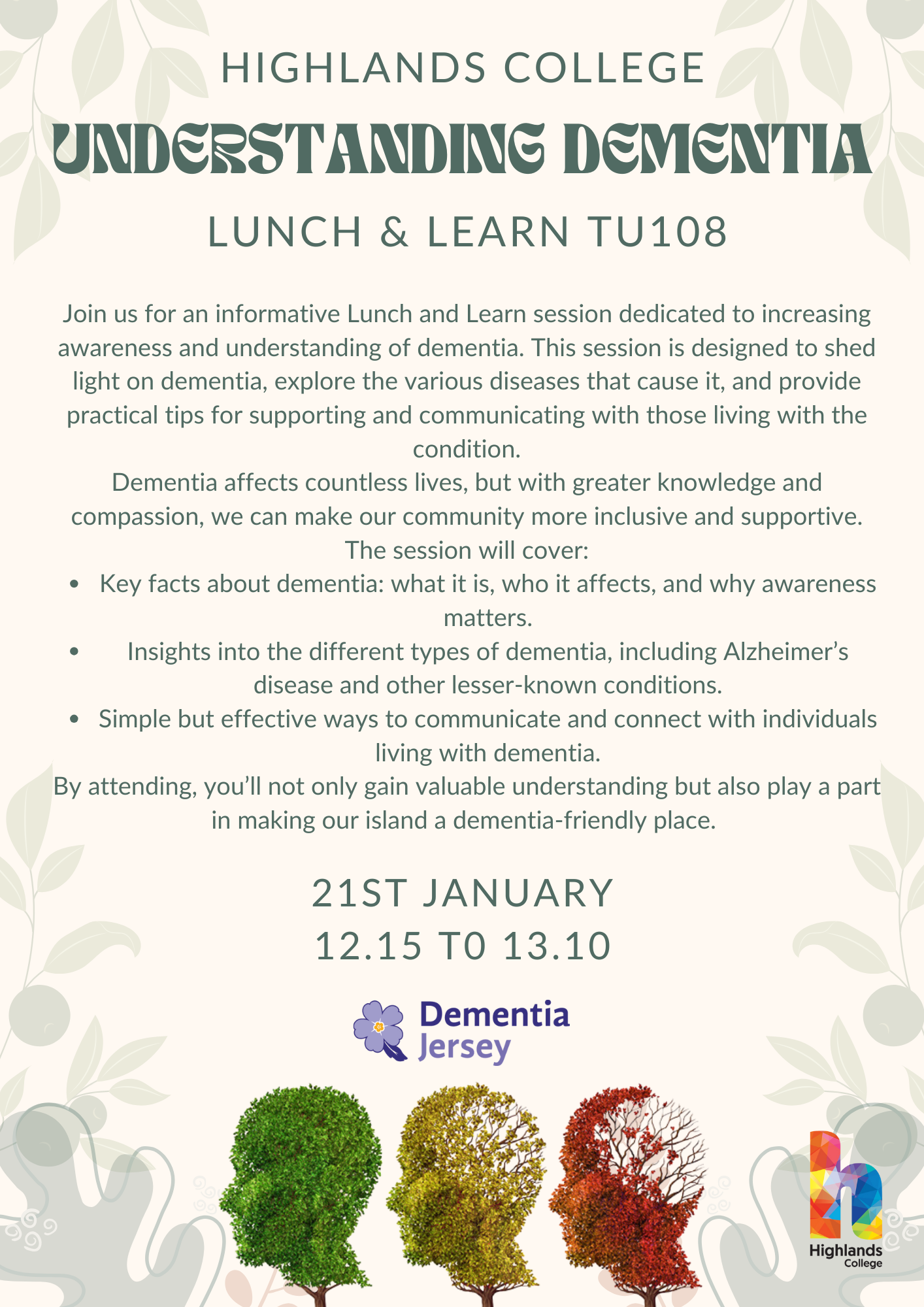 Understanding Dementia Lunch & Learn – 21/01/25 – TU225 (new room allocation!) – 12.15 to 13.10 Dementia Jersey will be delivering two valuable sessions one on Understanding Dementia and one on Brain Health. The first session focuses on understanding dementia, while the second session, scheduled for 14 March, will explore brain health in depth. An invitation will go out later via TLD. .