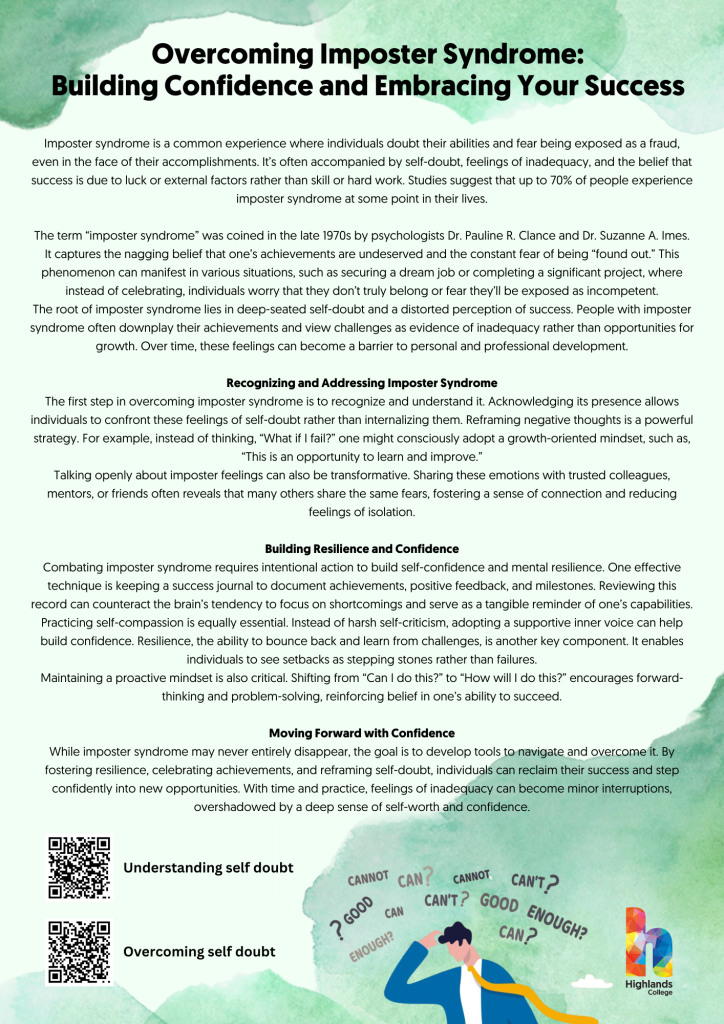 Today’s post is about imposter syndrome with attached QR codes to two videos on understanding self doubt and overcoming self doubt. .