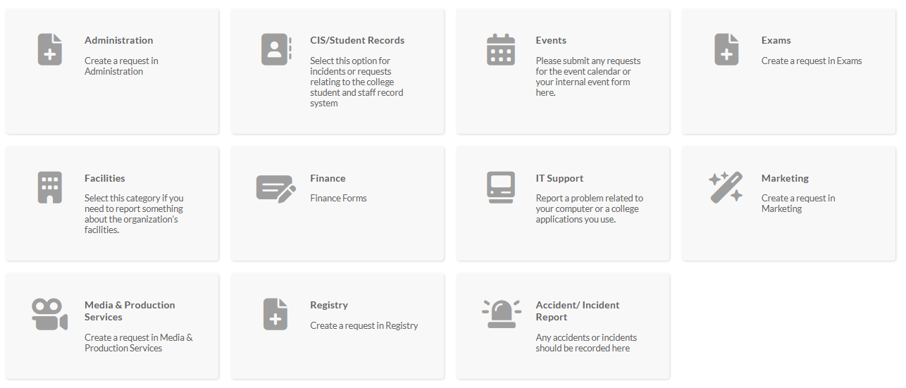 Admin, Estates, Exams, IT, Finance, CIS, Registry, Media, Events, Marketing, or for any Incident Reports.